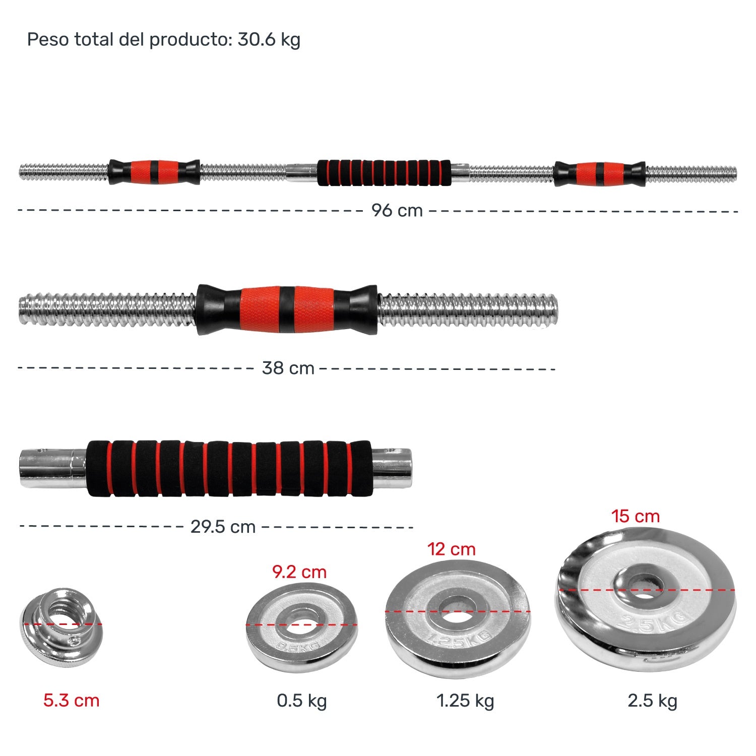 Set Mancuernas Ajustables 30 Kg 16 Pesas Barra Recta 3 En 1