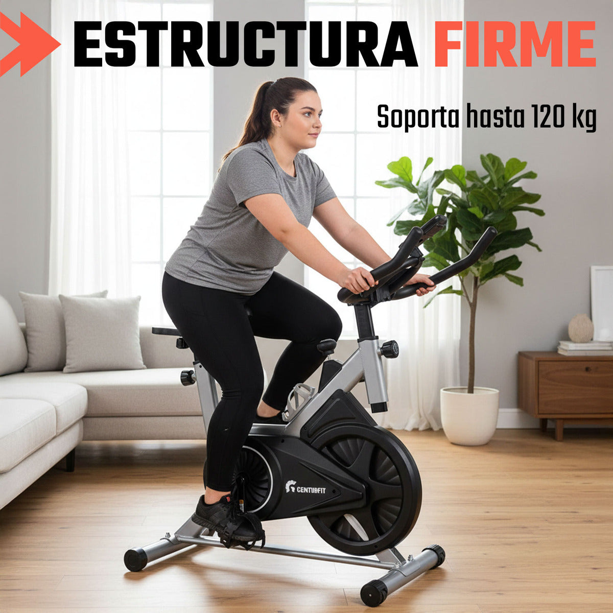La Bicicleta de Spinning CENTURFIT de 6 kg está diseñada para entrenamientos cardiovasculares intensos y constantes desde casa. Su estructura de acero, sistema de resistencia por banda y rueda de inercia de 8 kg ofrecen una experiencia estable y fluida, ideal para mejorar la condición física y la disciplina diaria.