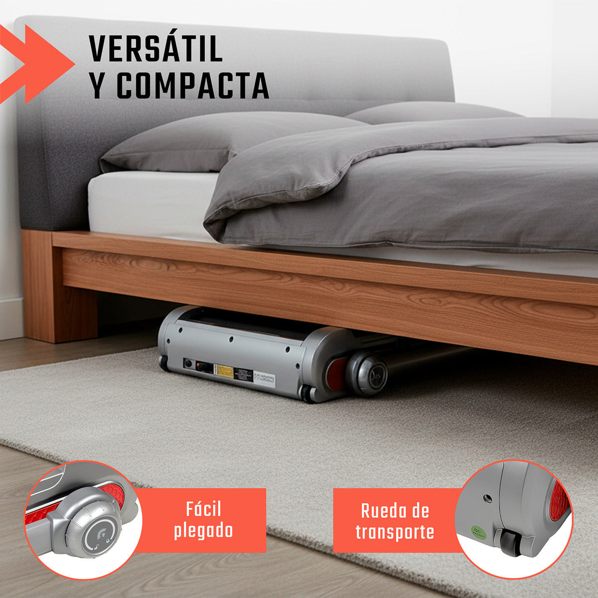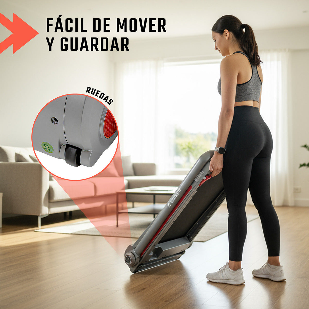 Con un marco de 111 x 56 cm y plegado a solo 17 cm de alto, esta caminadora se adapta fácilmente a espacios reducidos. Gracias a sus ruedas de transporte, podrás moverla sin esfuerzo.