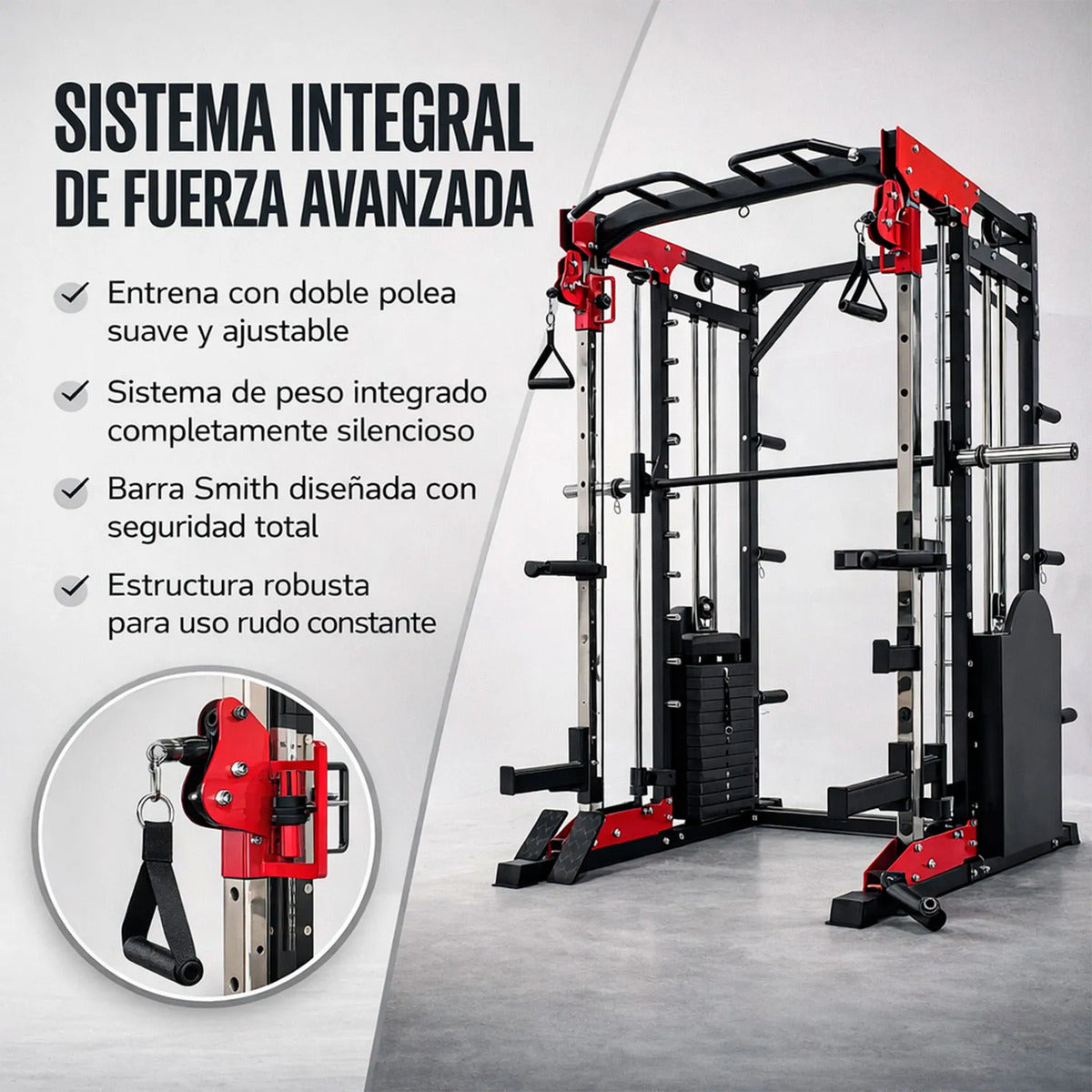 Gracias a su configuración profesional, múltiples accesorios y sistema de poleas, este equipo permite realizar rutinas completas con estabilidad, control y seguridad, adaptándose a diferentes niveles de entrenamiento.