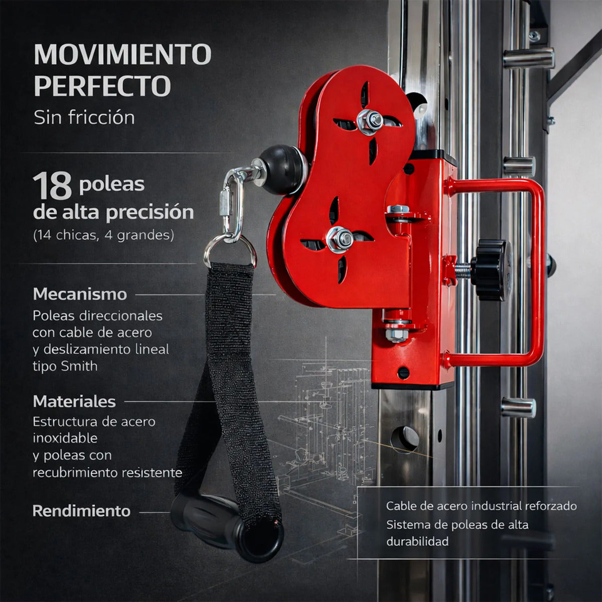 Integra un sistema de poleas con múltiples configuraciones que permiten realizar ejercicios controlados para tren superior e inferior, mejorando la técnica y el rango de movimiento.