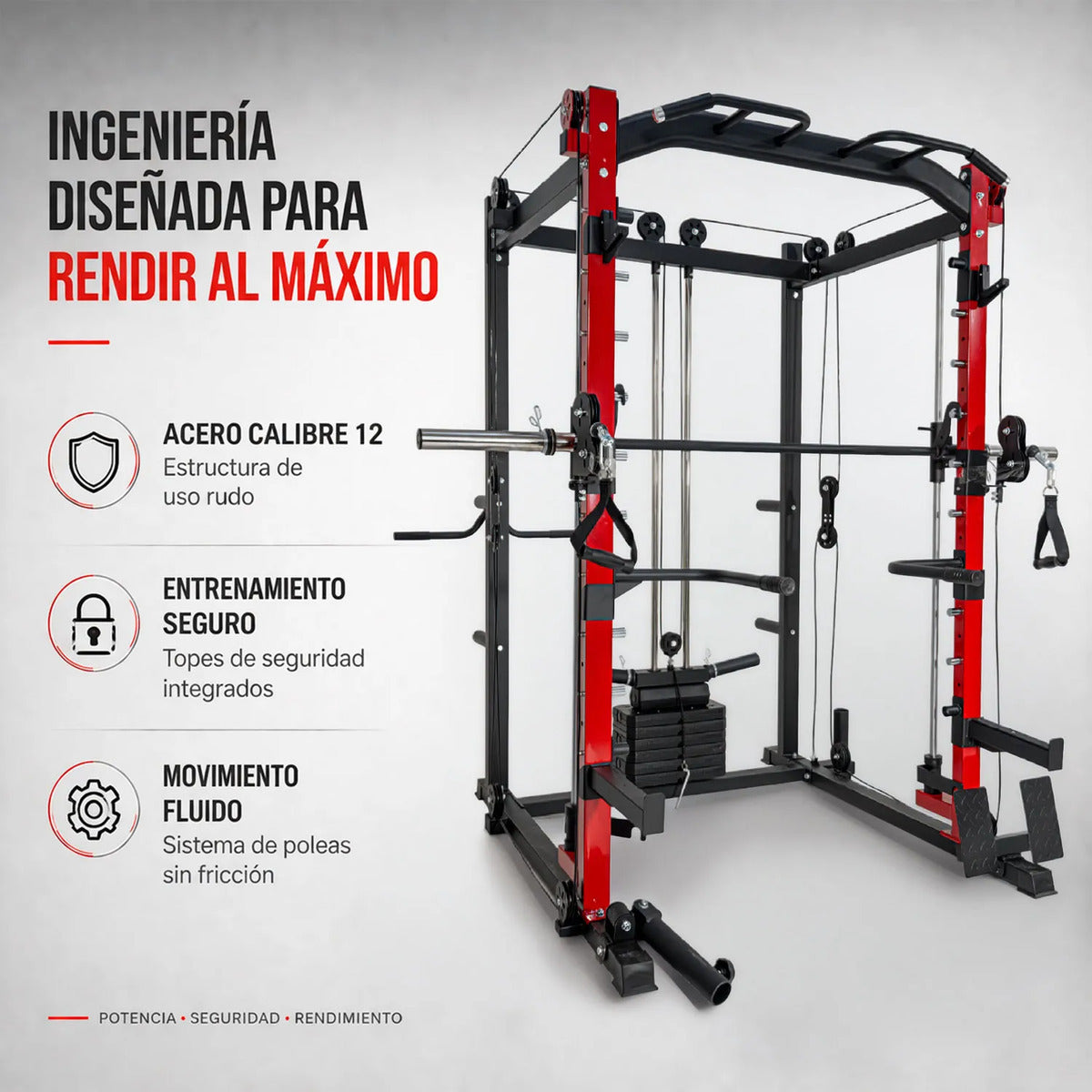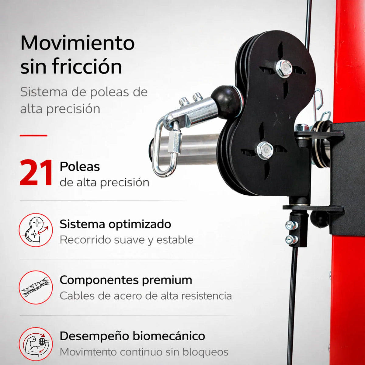 Cuenta con múltiples poleas de distintos tamaños que permiten realizar ejercicios de tracción, empuje y aislamiento muscular. Este sistema mejora la fluidez del movimiento, proporcionando un entrenamiento más controlado y efectivo.