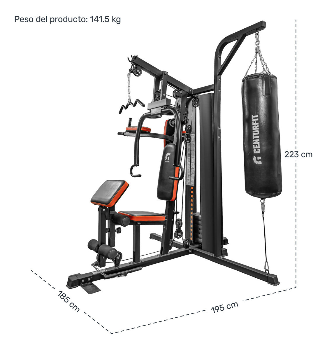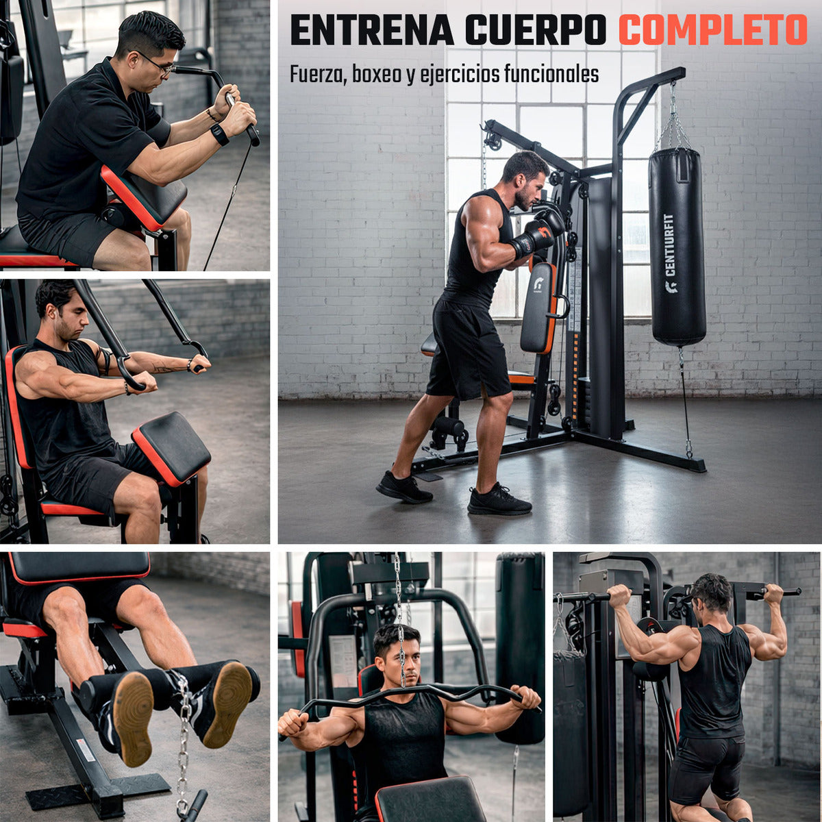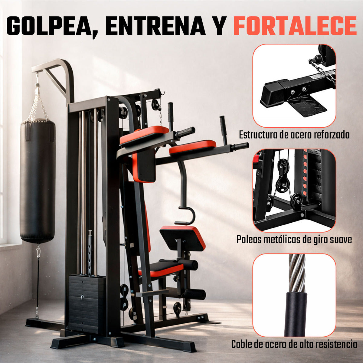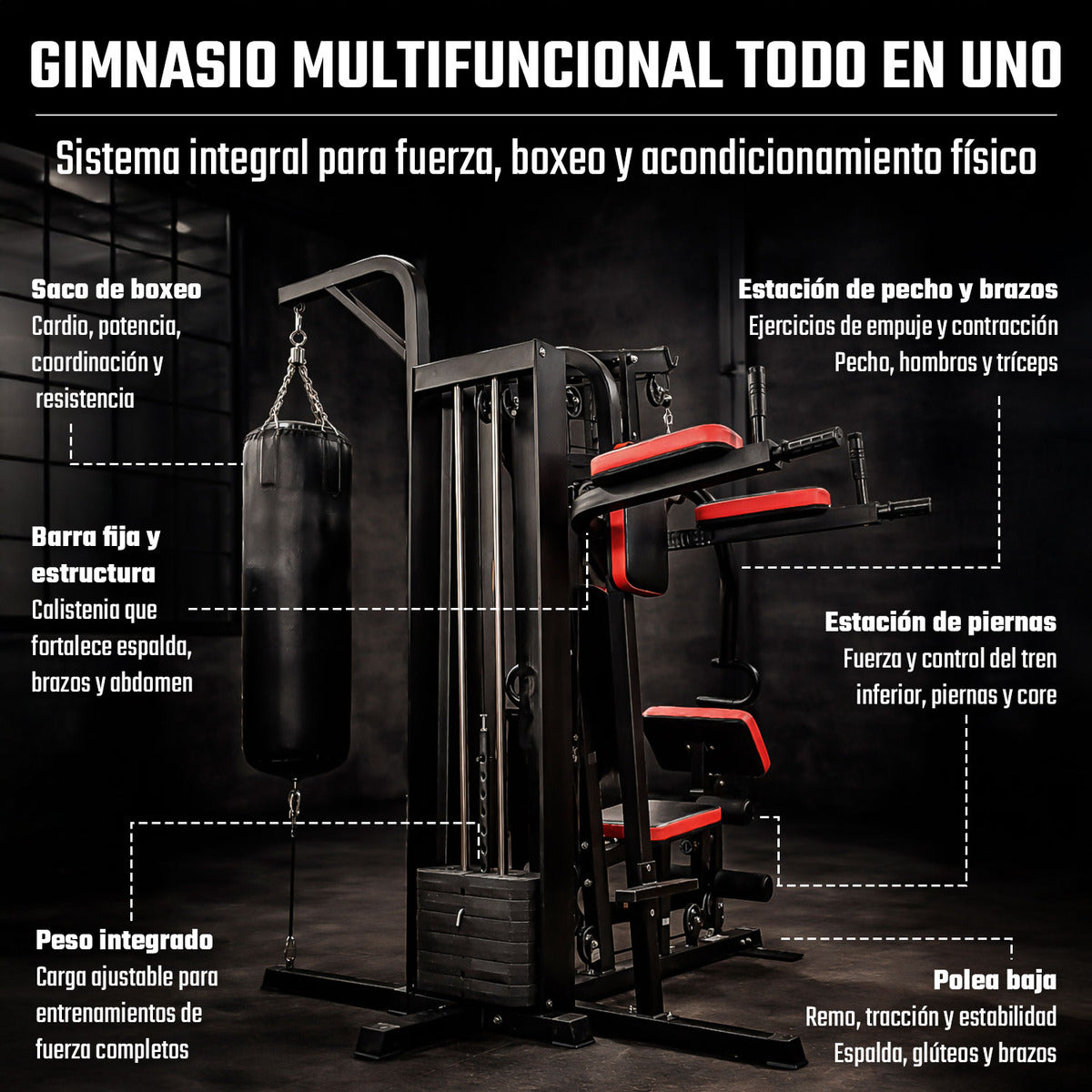 La Multiestación de Gimnasio CENTURFIT con Saco de Box está diseñada para el guerrero moderno que entrena fuerza, resistencia y combate desde un solo equipo. Su estructura de acero reforzado, torre de pesas integrada y estación de boxeo la convierten en una solución completa para entrenamientos funcionales, musculares y cardiovasculares, ideal para usuarios intermedios y avanzados que buscan máxima versatilidad.