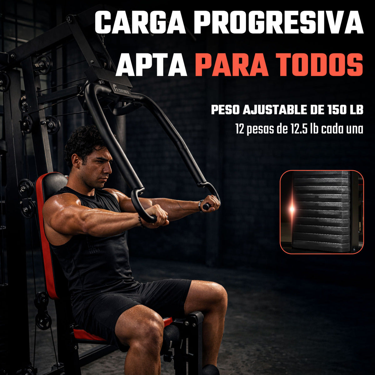 Fabricada en acero de alta resistencia con acabado mate, esta multiestación ofrece una base sólida capaz de soportar entrenamientos exigentes. Su peso estructural de 141.5 kg y capacidad de carga de usuario de hasta 250 kg garantizan estabilidad, durabilidad y seguridad en cada ejercicio.