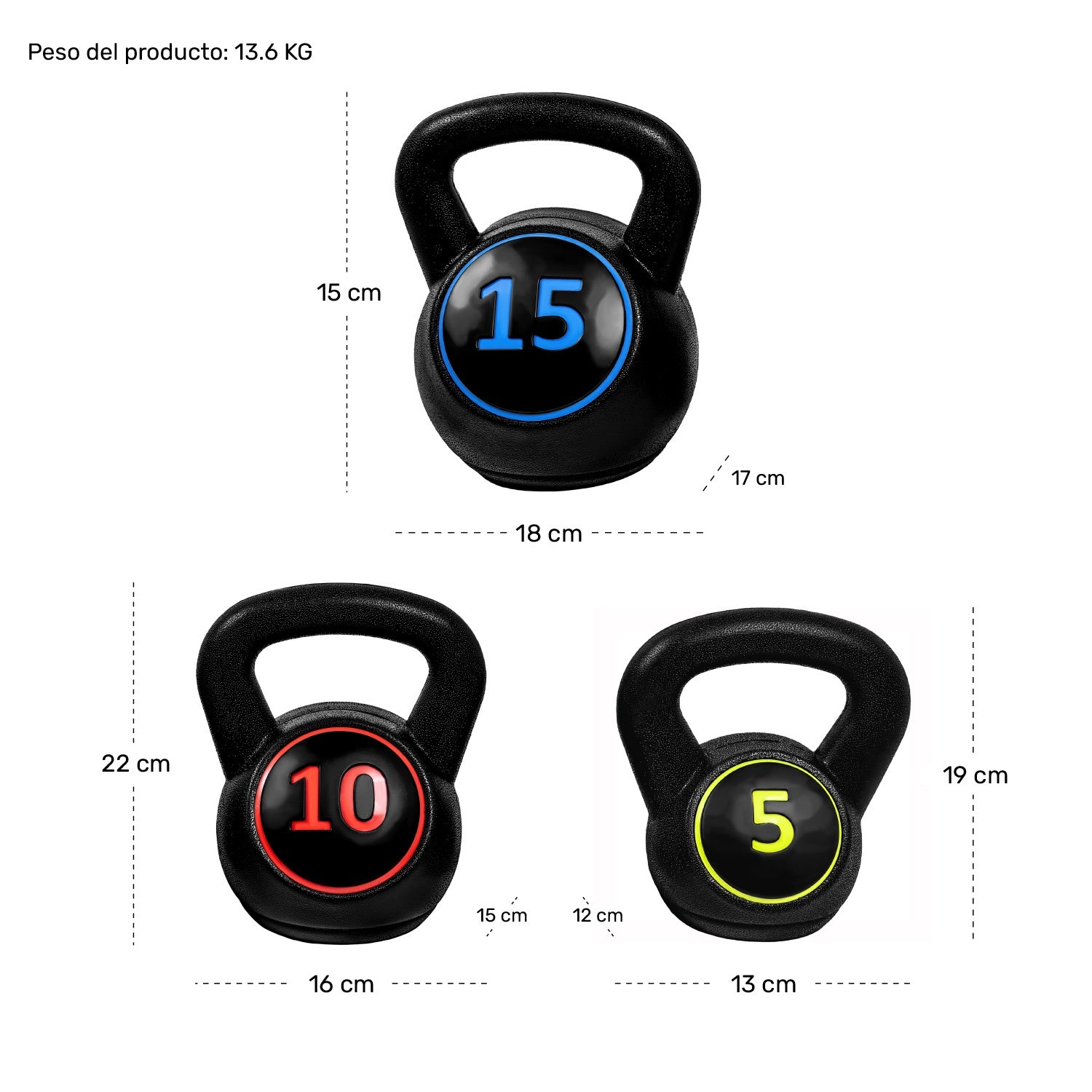 • [Set de pesas rusas de 2.2, 4.5 y 6.7 kilogramos]